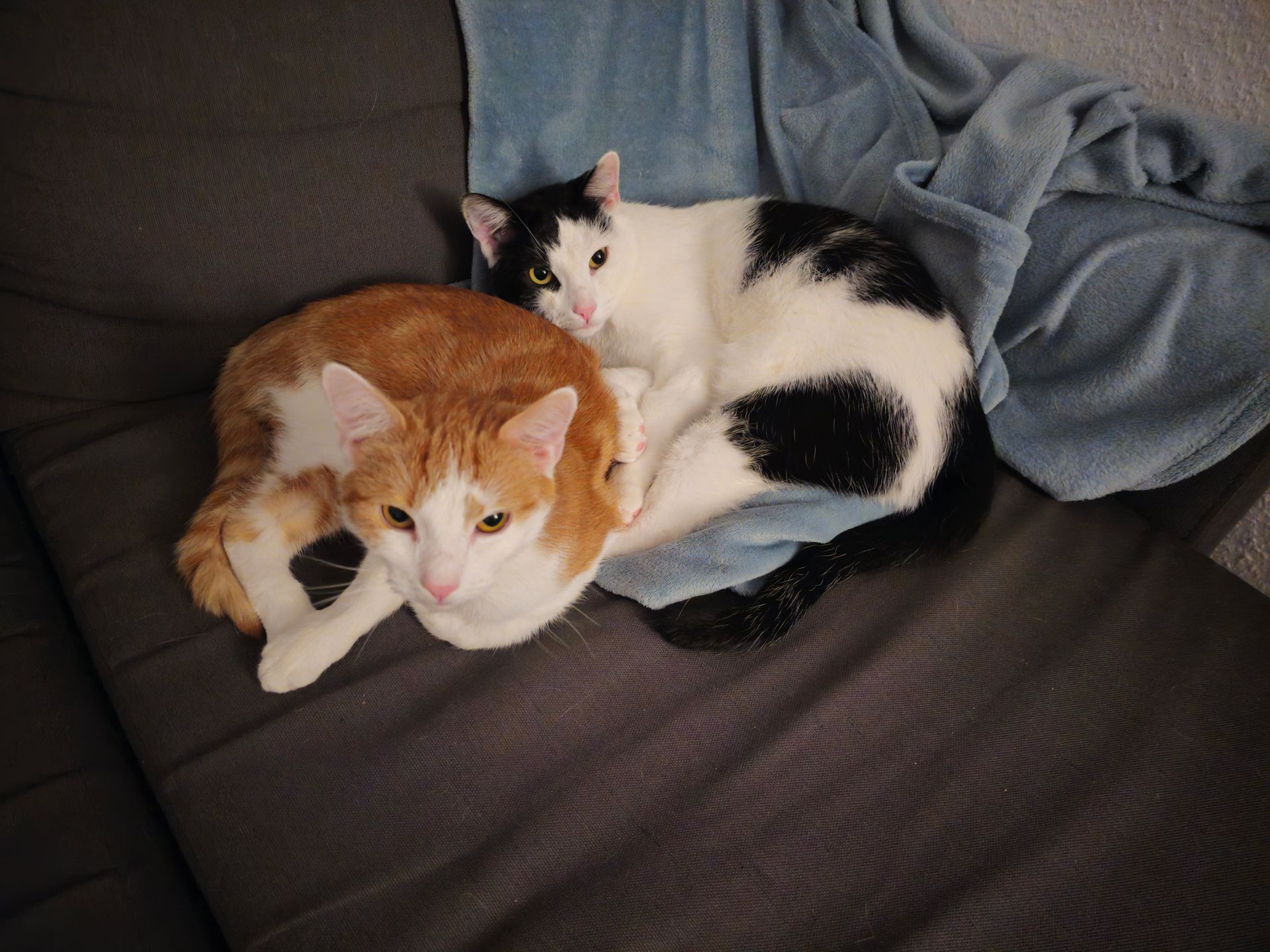Katze schwarz,etwas weiß am Hals und am Unterbauch. Beide nicht kastriert und auch nicht geimpft. Letzte Floh Behandlung vor ca.3 Wochen. Sind im Haushalt groß geworden mit einem aufgeweckten Mädchen. Sind Freigänger.