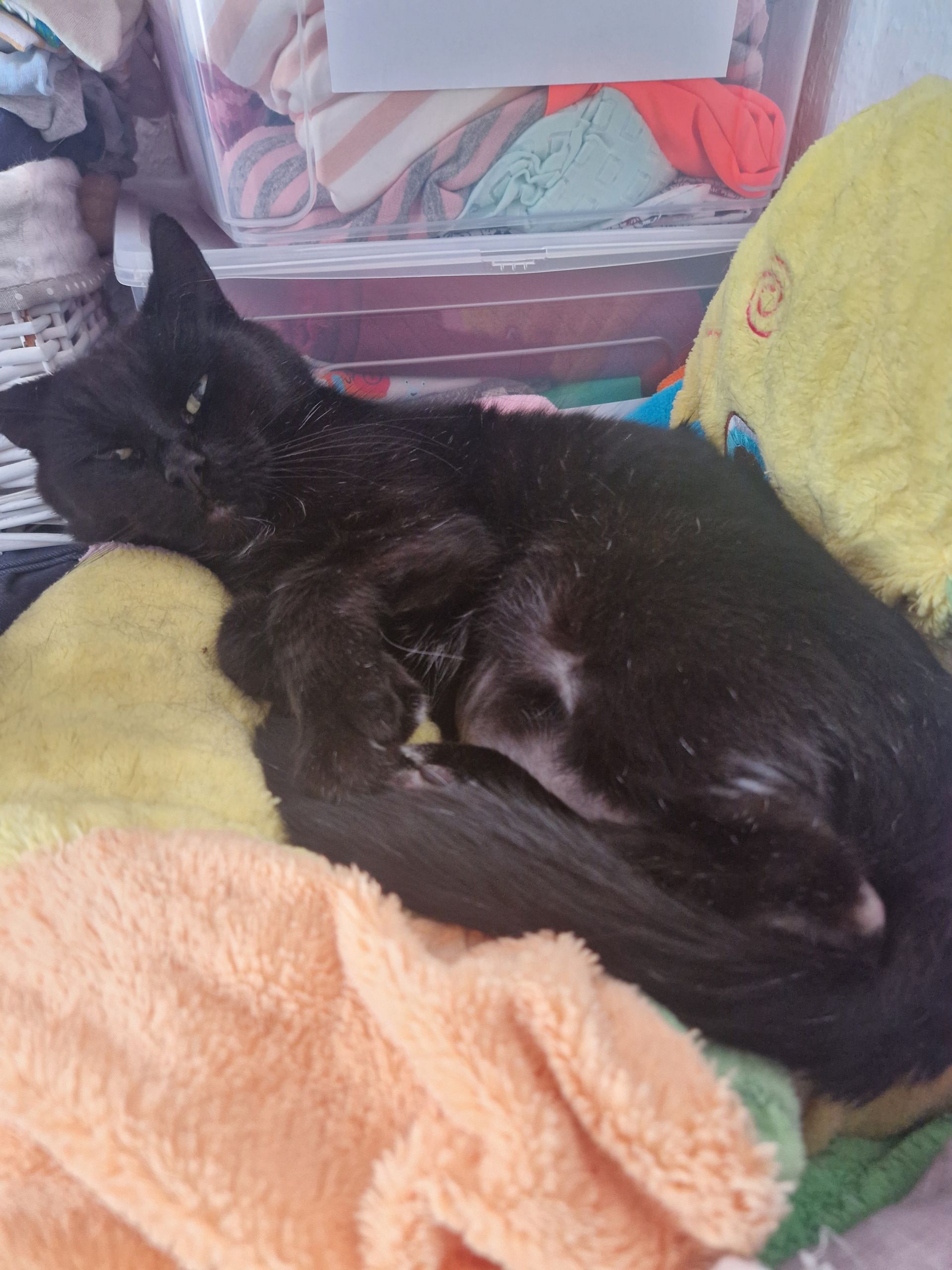 9 Monate alte katzen,m/w. Der Kater schwarz,3-4 Haare weiß am Hals.
