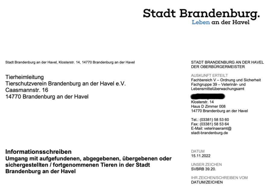 "Da Ihnen die Zahl der in der Stadt Brandenburg an der Havel unterzubringenden Tiere im angefragten Zeitraum durch Ihre eigene monatliche Abrechnung bekannt sein dürfte, erübrigt sich hier die Akteneinsicht gem. § 6 Abs. 4 AIG. Lediglich zu 6 Tieren wurde im Jahr 2022 Individualverträge geschlossen. Diese Akten fallen unter § 5 Abs. 1 Nr. 3 AIG. Ein Antrag auf Akteneinsicht ist abzulehnen, wenn Betriebs- oder Geschäftsgeheimnisse zugänglich gemacht werden. Hier liegt keine Zustimmung der betroffenen Personen und Unternehmen zur Offenbarung vor. Das Auskunftsersuchen durch Akteneinsicht zu Ihrer Erlaubnis gem. § 10 Abs. 5 Hunde wurde an die zuständige Behörde weitergeleitet." Hiergegen wurde unserseits Widerspruch eingelegt. Denn: Entgegen der Darstellung des Veterinäramtes, ersucht der Tierschutzverein Brandenburg an der Havel e.V. um eine fachlich und sachlich richtige und vollständige Beantwortung seiner Nachfragen, die vorliegend Informationen betreffen, die ihm explizit weder vorliegen, noch in zumutbarer Weise aus allgemein zugänglichen Quellen beschafft werden können. Mithin kann die Argumentation des Veterinäramtes schon allein aufgrund bestehender Widersprüche nicht nachvollzogen werden. So führte die Stadt Brandenburg an der Havel bereits selbst mehrfach – auch schriftlich und öffentlichkeitswirksam zu bestehenden Individualverträgen mit dem Tiere e.V. aus und weicht allein dort in irreführender Weise erheblich von den nun mit Bescheid vom 27.07.2023 dargelegten Angaben ab. Fraglich ist insofern, wie viele Tiere durch die Stadt Brandenburg an der Havel entgegen des bestehenden Vertrages tatsächlich anderweitig untergebracht wurden, ohne dass eine Beteiligung des bestehenden Vertragspartners oder eine Unterbringung bei diesem überhaupt erfolgte oder in Betracht gezogen wurde.